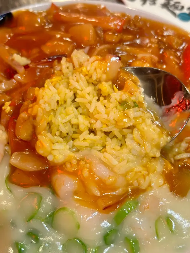- 這道炒飯色澤誘人,米粒飽滿與鮮嫩雞肉、鴨肉完美融合,蔬菜爽脆清新,白色嗰邊有新鮮嘅菜頭同埋蝦仁,炒底落得夠多蛋,