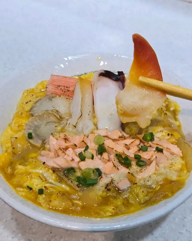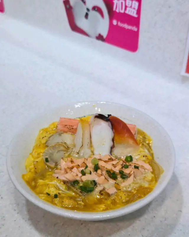 丼飯鋪滿滑蛋、北寄貝、馬刀貝、帆立貝同三文魚粒,全部火炙過🔥!貝類爽口鮮甜,三文魚粒油脂香濃,最正係滑蛋嘅醬汁滲透落飯~