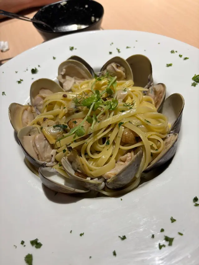 再來蒜香蜆意粉!扁意粉捲成小山丘,蜆肉肥美到快溢出殼,每顆都吸滿蒜片+白酒湯汁,入口鮮甜彈牙!綠色香草+微辣紅椒粒點綴,簡單卻超開胃~盤邊還有蜆汁光澤,叉一圈麵吸滿醬,幸福感爆棚!
