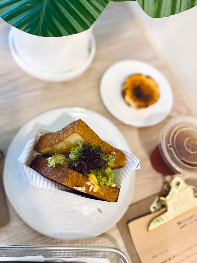 脆脆的丹麥多士,塗上甜甜的蜜糖,配上香滑的炒蛋,兩大片的培根和火腿,加上濃濃的起司,還有新鮮的蔬菜。