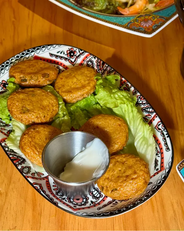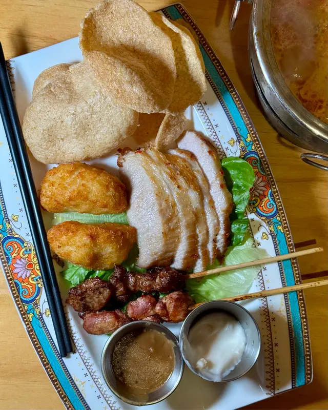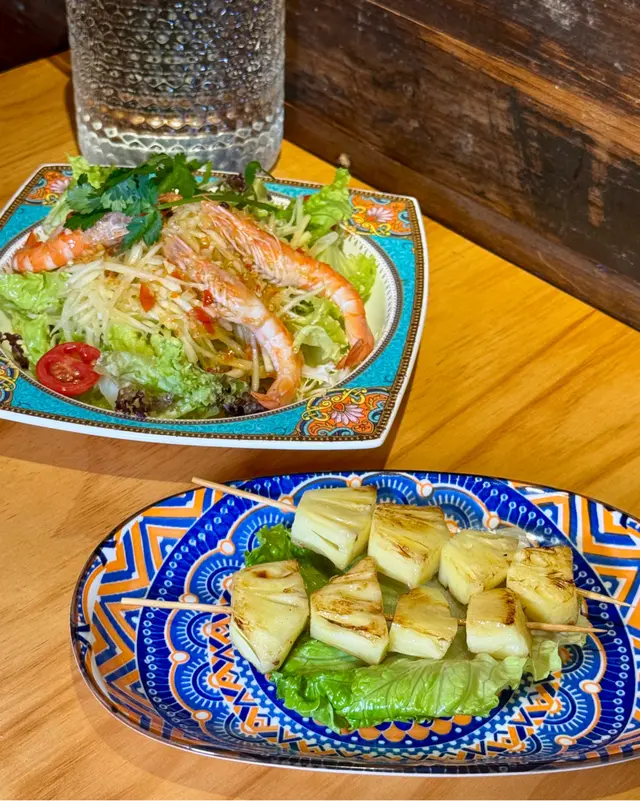 今次試咗性價比超高嘅2人套餐!泰式鮮蝦青木瓜沙律開胃,木瓜絲脆脆彈牙,配四隻大蝦超鮮甜,酸辣醬汁唔會over,啖啖都提神醒腦,正好中和之後嘅重口味。小食拼盤係highlight,雞豬串燒外脆內嫩,沙嗲醬花生香爆棚,蝦餅彈牙到停唔到手;冬蔭功湯海鮮版勁多料,酸辣適中唔會燒喉,海蝦青口夠份量。主菜脆皮豬手泰皇炒飯意外好味,豬手皮脆肉嫩,飯粒裹住椰香,食落去暖呼呼。三色芒果糯米飯收尾,藍綠白米飯顏值高,芒果甜到心坎,配椰雪糕一啖就融化,甜度剛好唔膩。泰式奶茶熱版少奶,茶底香滑順喉,完美ending。