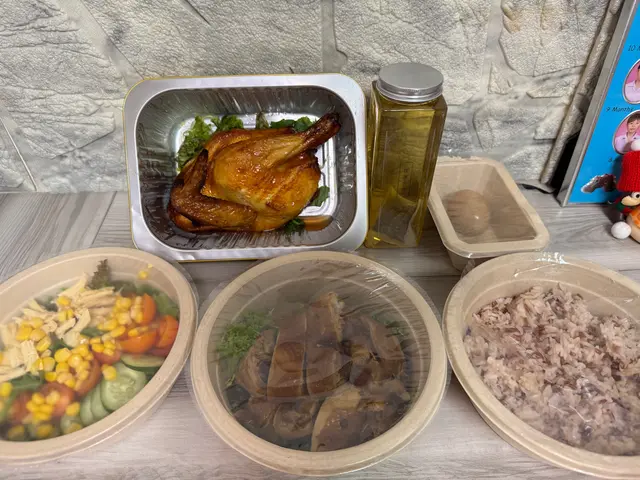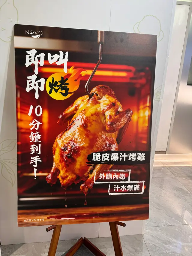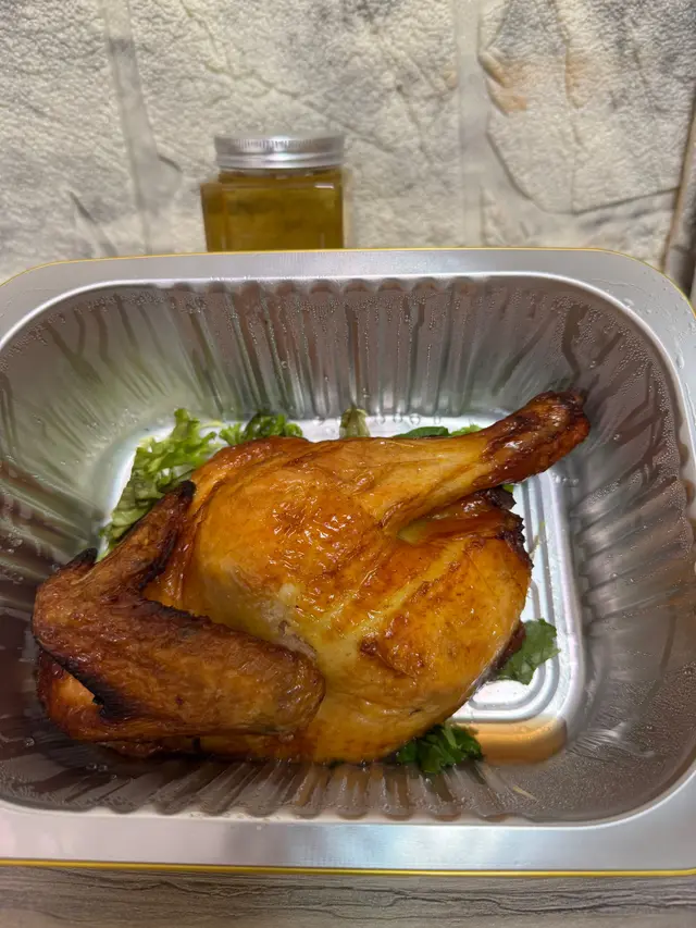 用新鮮嘅雞隻製作成烤雞, 金黃香脆雞皮, 薄透爽脆, 又酥脆, 肉質嫩滑有雞味, 雞係醃過再燒焗而成, 高溫鎖住肉汁, 好入味, 連皮食都冇罪惡感呀! 即叫即烤, 絕不預製, 10分鐘就有, 新鮮熱辣到手中, 有埋椒鹽比你調味, 仲可以配白飯/ 三色米飯/ 湯米粉, 或者買原隻加餸都得。