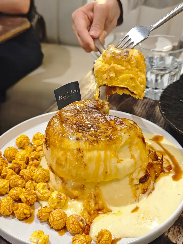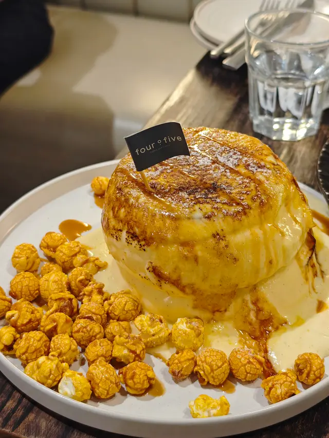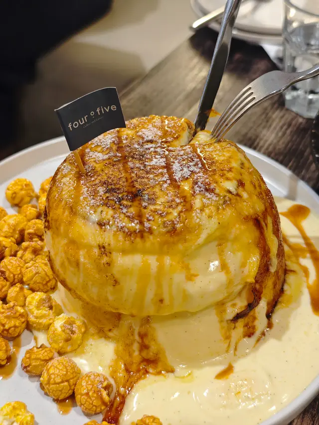 佢地個梳乎厘班戟好似轉左做法,以往個size已經好大,今次黎食嘅size直頭係巨!兩大件嘅梳乎厘加左勁多鮮忌廉瀑布咁款,燒到表面形成焦糖有少少脆又好香。成個梳乎厘空氣感好正,唔易扁身而且食落有陣陣蛋香,側邊仲有D焦糖爆谷,成個甜品我比200分!!
