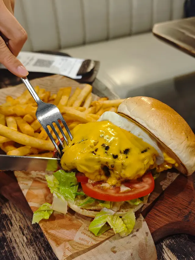 內層有半熟蛋,芝士,安格斯牛肉,蕃茄,蔬菜,咁多層食落成個口感係豐富,加左個半熟煎蛋令到個口感更加濕潤幾唔錯。另外仲有薯條,都幾多。