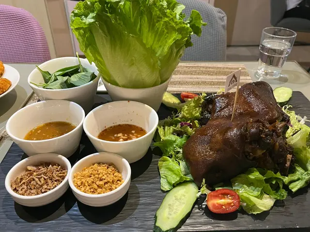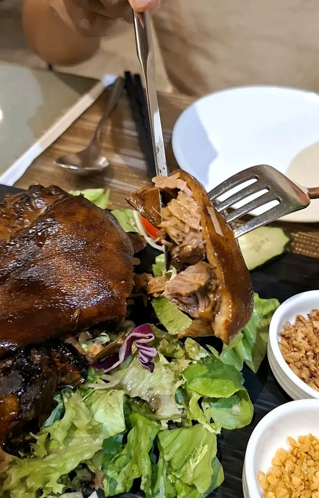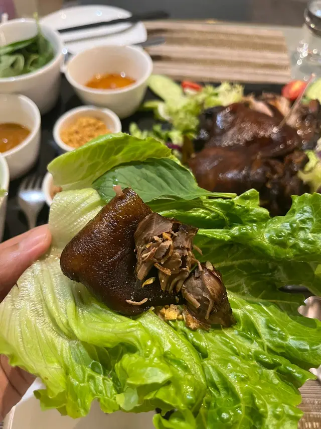 豬手肉質真係煮得非常軟嫩,火喉控制得好好,輕輕一切就已經切開,肉質嫩滑,膠原勁豐富,入口即化。配有生菜、九層 塔、炸蒜、炸香蔥,甜酸汁及生蝦汁等配料,可按自己口味喜好加入。