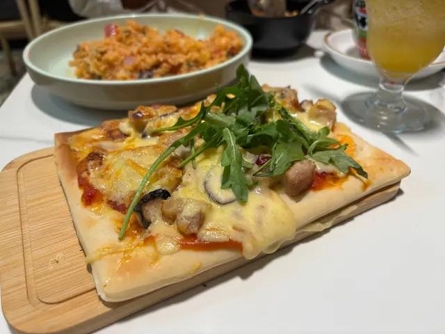 可以自選三款配料,我哋揀咗雞肉+芝士+野菌,份量十足,而pizza餅底係厚批,非常飽肚。