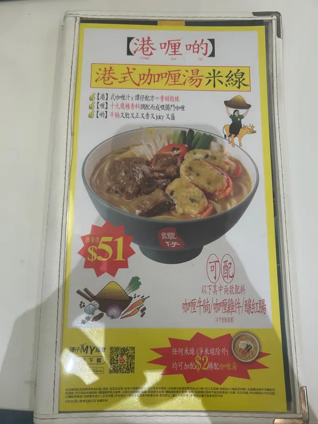 譚仔港式咖喱湯米線🍜 mmila等级32025-04-2524 浏览 关注 味道都幾唔錯 覺得下次食會再叫😋咖哩味幾惹味同順口 ✨味道堅港式 似車仔麵舖果種同米線幾夾又唔會太咸👍🏻本身湯底冇加辣嘅話唔好太辣所以食唔到辣嘅朋友都會食到~以往有啲湯底味精感覺太勁 食完會口渴但係呢次調味係幾正常配料可以揀要牛腩、雞件定醃紅腸🙌🏻今次我揀咗牛腩同雞件又有牛又有雞都幾豐富平時自選配料加$2都有得轉咖喱湯牛腩有彈性 肉質唔柴💖雞肉相比起嚟比較細件 但係都係好鮮嫩🥹價錢唔貴可以一試!以上食记乃用户个人意见 , 并不代表OpenRice之观点。1分享譚仔港式咖喱湯米線🍜 譚仔雲南米線 (元朗千色匯) https://s.openrice.com/QrLT0Gy0jW0检举 张贴 评分5味道4环境4服务4卫生5抵食用餐日期2025-04-24用餐途径堂食