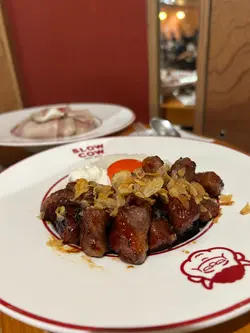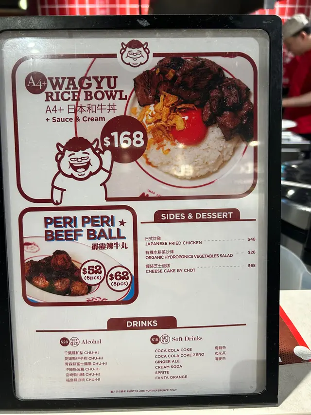 有和牛,脆香蒜片,蘭王生雞蛋黃,珍珠白飯,醬汁可以自選款式,和牛軟腍,肉味濃郁,入口即化;醬汁方面揀左佢地嘅牌紅酒照燒汁,一上枱就聞到好香紅酒味,醬汁味道偏甜但牛肉嘅味道好夾
