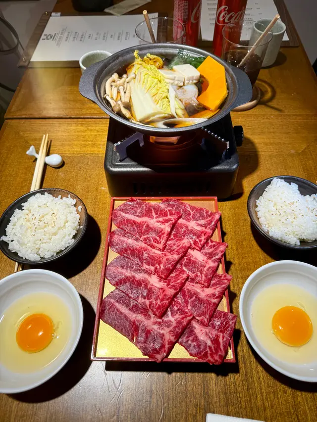 和牛壽喜燒,壽喜燒的牛肉,採用澳洲和牛,肉質嫩滑有牛味,相當不錯。配合一大鍋的蔬菜,相當健康。另外有雞蛋,可以打散做汁,或者原隻熟食。