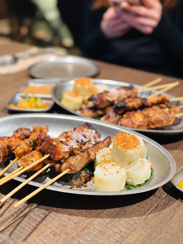 幾欣賞呢啲串燒肉粒大小適中、 火喉控制幾好, 唔會好乾柴, 沙嗲醬另外跟埋酸酸甜甜既青瓜蘿蔔絲比你清下味蕾! 蕉葉飯團比較有趣, 軟綿綿, 個樣似玉子豆腐, 係面有啲炸椰絲有少少甜味。 但我地都一般呢種飯團🤣