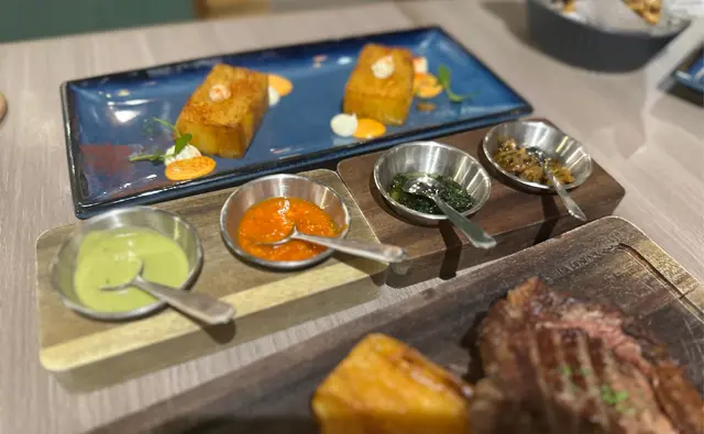 火候精準,焦脆外層鎖住肉汁,隨餐附上四款自調醬汁:阿根廷青醬的香草清新、煙燻青醬的層次感、guasacaca的醇厚,還有自家制辣醬,體現店主對食物的堅持。