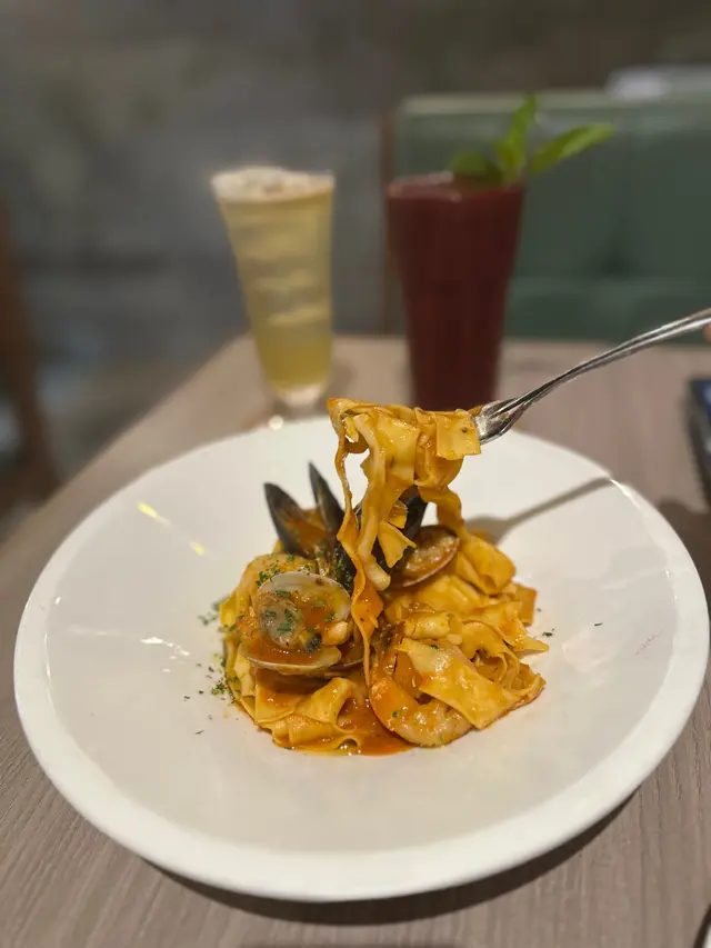用左每日鮮製的寬扁麵,掛汁力驚人,彈牙有嚼勁。微辣番茄醬汁加上蜆肉,青口,大蝦等海鮮,鮮味十足。