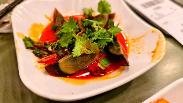 跟住就係另一樣小食經典——皮蛋。譚仔嘅皮蛋處理得好好,個溏心做得啱啱好,晶瑩剔透,睇落好吸引。佢哋會將皮蛋切開幾份,再淋上特製嘅辣汁,面頭灑上新鮮嘅芫荽同蔥粒,賣相都好靚仔。皮蛋獨特嘅甘香味,配上微辣帶甜嘅醬汁,再加上芫荽同蔥嘅清新,成個配搭好夾,陣陣香味撲鼻,食落口非常惹味,完全中和咗皮蛋有時可能會有嘅少少澀味,令人一試難忘!