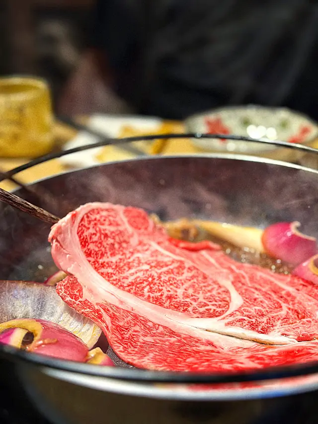 呢個壽喜燒包咗250g嘅A4和牛肩胛🥓及野菜豆腐盤🥗,4大塊A4黑毛和牛肩胛,2個人share啱啱好。和牛雪花油花紋理勁靚🤩,店員會先幫忙以先煎後煮方式烹調,加入牛油及洋葱煎香,再放入一大片和牛,