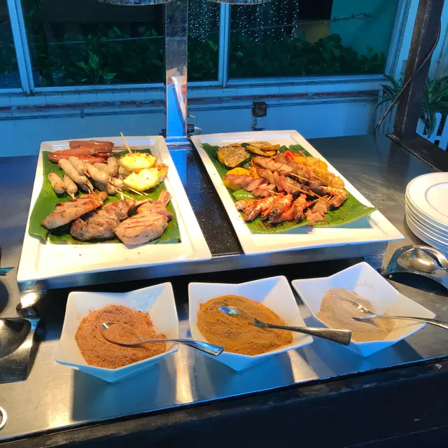門口位置的左手邊,泳池隔離有池畔燒烤及烤肉專區,見到有男職員不停為客人燒香腸、沙嗲雞肉串燒、燒豬串燒、燒牛肉串燒,燒菠蘿、燒大蝦、豬鞍、燒三色椒等,香氣撲鼻,豬鞍仲燒得好出色,豬肉燒得好嫩滑多汁。