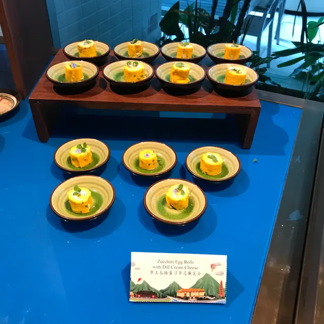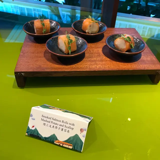 繼續前進,見到四款前菜,分別有煙三文魚帶子薯蓉卷、豌豆蓉蔬菜撻、翠玉瓜捲蛋刁草忌廉芝士、油甘魚漬物。每款一口大細,份量適中,味道都相當出色。