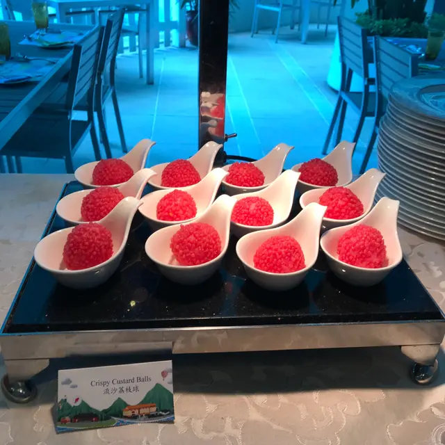 走返去正門位置,首先見到松露金豬鵝肝多士和柚子脆蝦球配柚子汁,兩款比較中式的菜式。自助餐乳豬皮竟然相當脆口,面層有金箔,配合鵝肝多士食,配搭相當驚喜。柚子蝦球蘸上柚子汁,酸甜開胃。