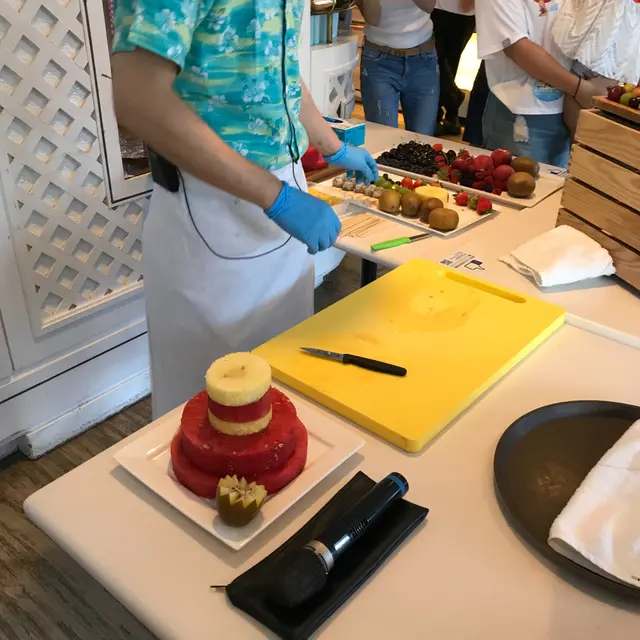 中場時間仲有生果工作坊,有職員教食客砌一個用生果做成的蛋糕。