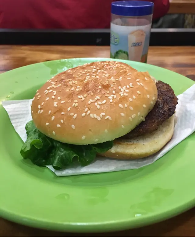 蕃茄片、生菜,以及薄薄的手打漢堡,上下兩片包不會太乾,因此起上來也尚算不錯。