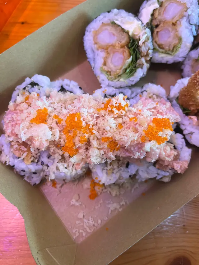 澎湃嘅沙津三文魚蓉點綴咗蟹籽鋪蓋卷物