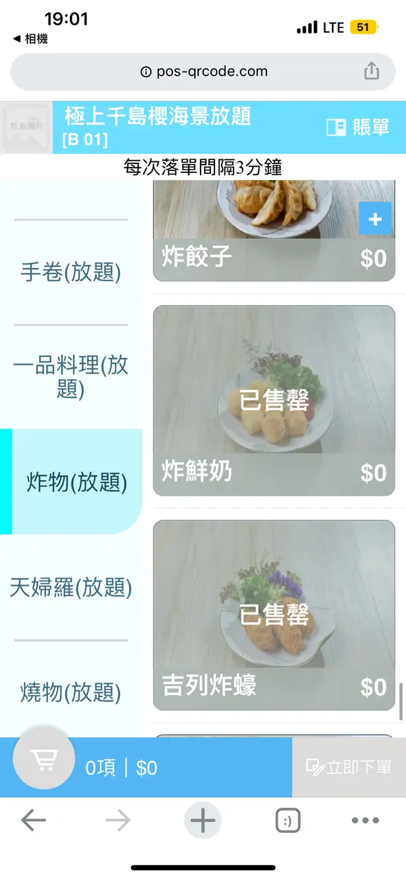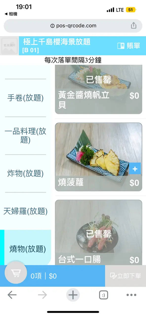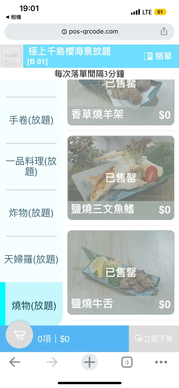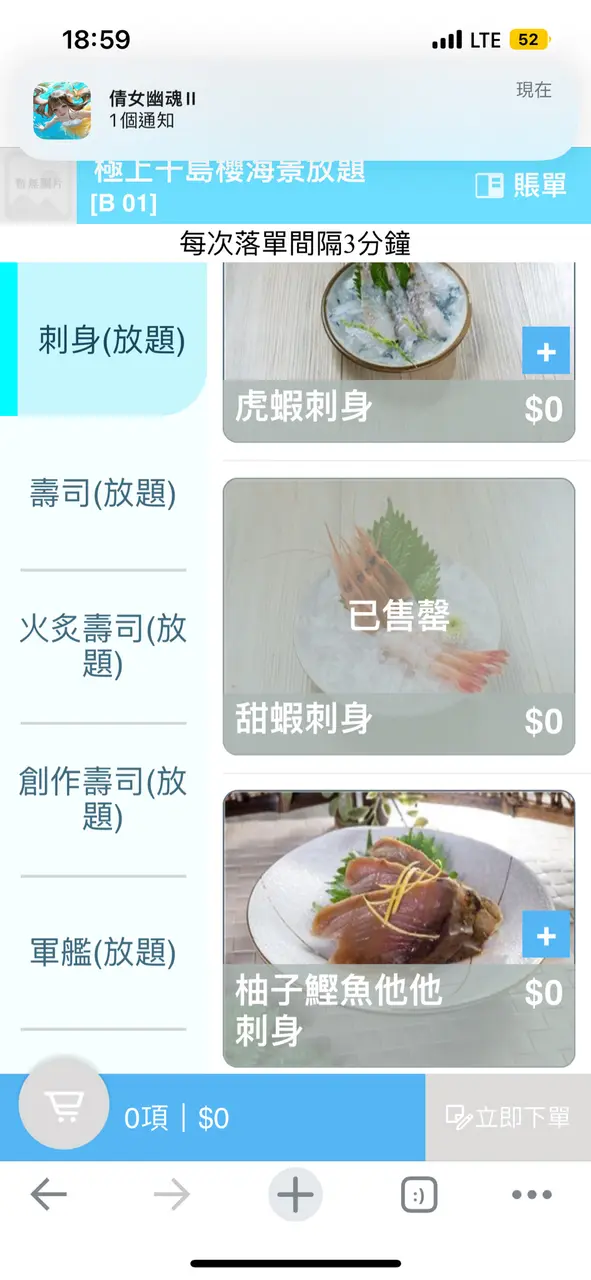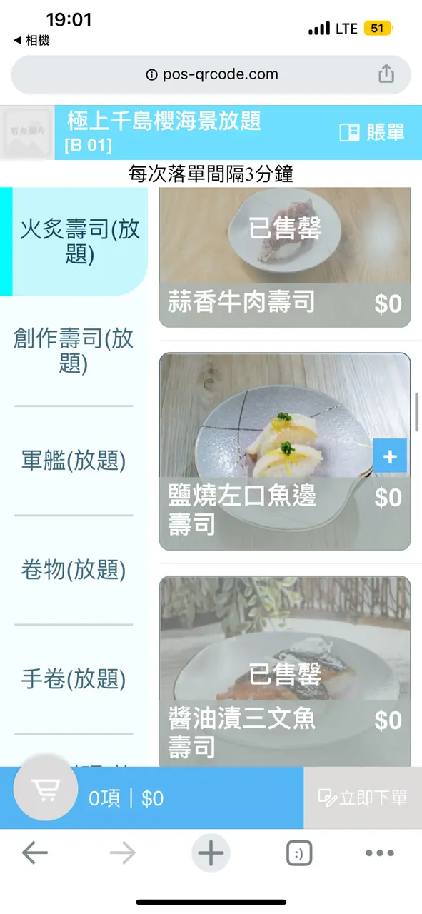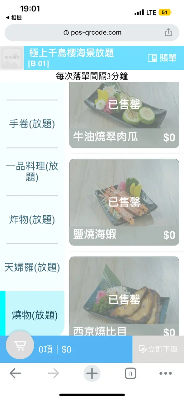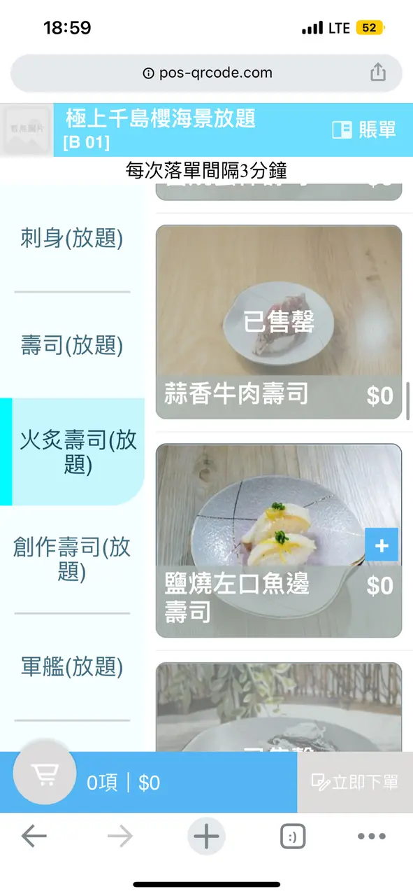 2.*開始售罄情況出現*:因為食放題好怕出現太多既浪費情況出現、所以第一輪我習慣唔叫數量多、但會每款食物叫一塊、岩食先再點。而神奇既事就發生啦!!!(前題18:30入座、晚市第一輪、只有4-5檯客)係我點完第一輪想食既野之後朋友就點佢想食既野、但突然牛利、翠玉瓜、羊架等等已經出現開始出現售罄、冇就唔食呢啲食其他係咪?但再登入版面、更神奇啦~佢突然全部燒物同一品類既食物全部售罄,換而言之,剩番刺生同壽司可以食!what !?難道我唔係食緊放題咩??發生咩事啊?