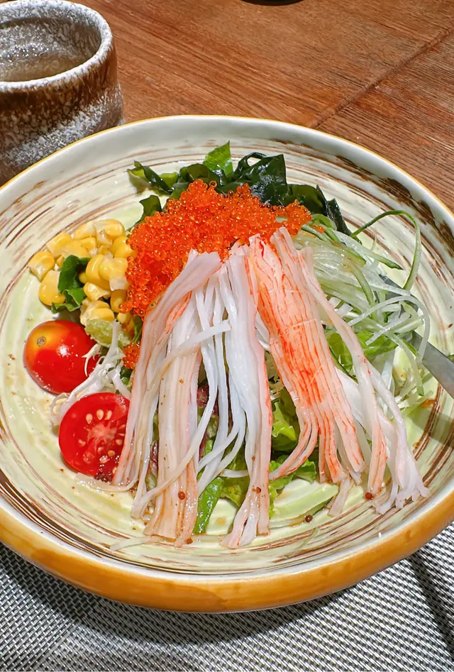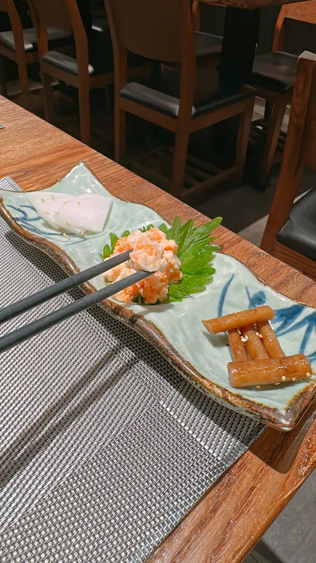 前菜有漬物三點+時令沙律,漬物有酸白蘿蔔、明太子沙律及牛蒡漬,今晚時令沙律係蟹籽沙律,沙律份量都好多,2款前菜酸味味好開胃
