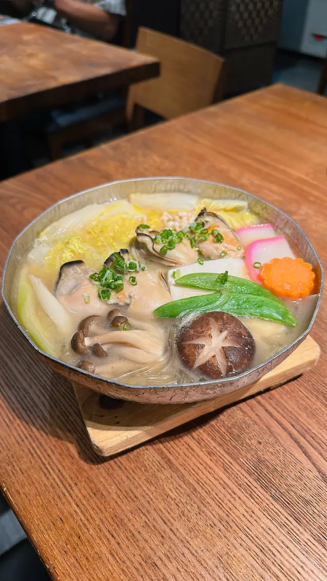 🦪廣島蠔味噌菜鍋:4隻大大隻廣島蠔+海量配菜,味噌鍋有大量菇菌、菜、豆腐、京蔥相當健康,仲有我最愛嘅水晶粉!湯底用味噌調味,唔會好濃,清新健康組合~
