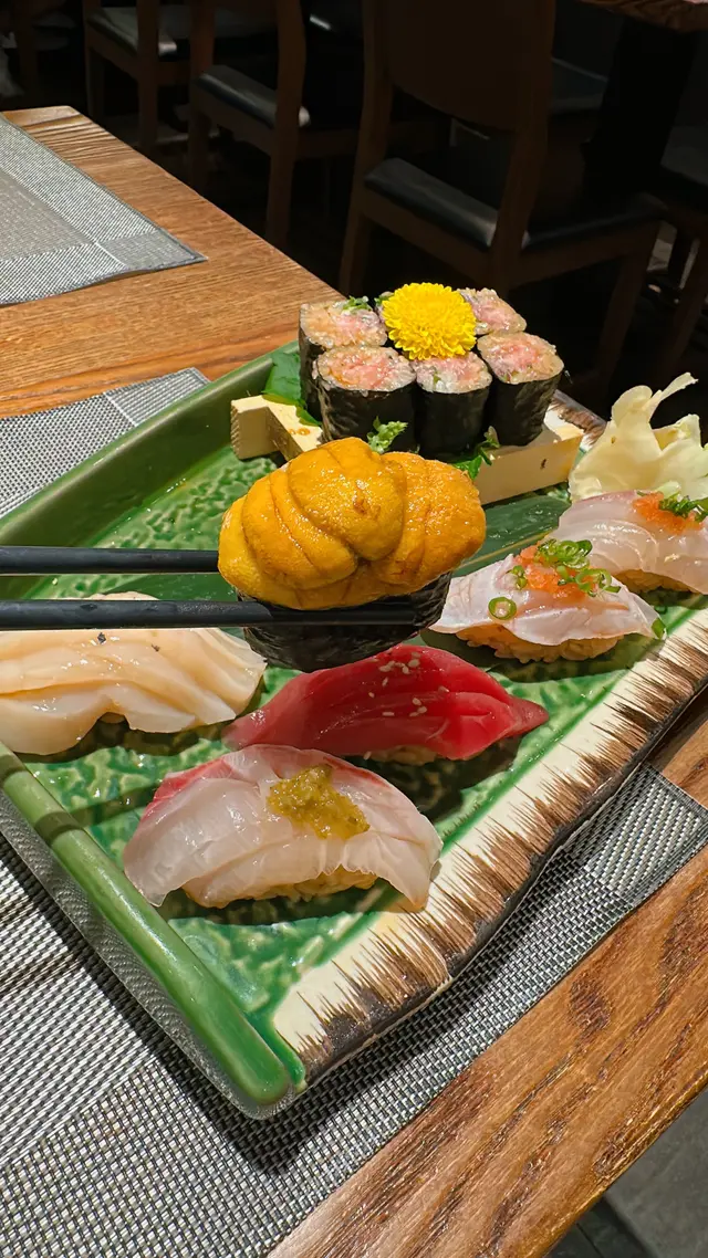 壽司拼盤賣相十足!內有:赤身、深海池魚、真鯛、帆立貝、金日鯛、日本海膽、拖羅蓉小卷。全部都好新鮮無腥味,當中有平時比較少食到嘅魚類,配搭都幾特別,要讚帆立貝同日本海膽,前者鮮甜、後者份量超多!有成3層!滿口海膽勁滋味!