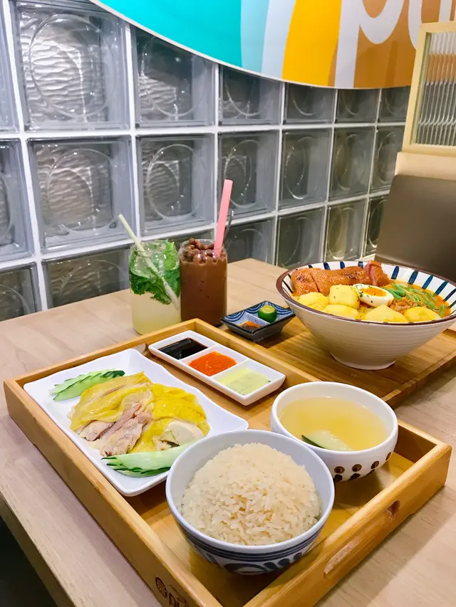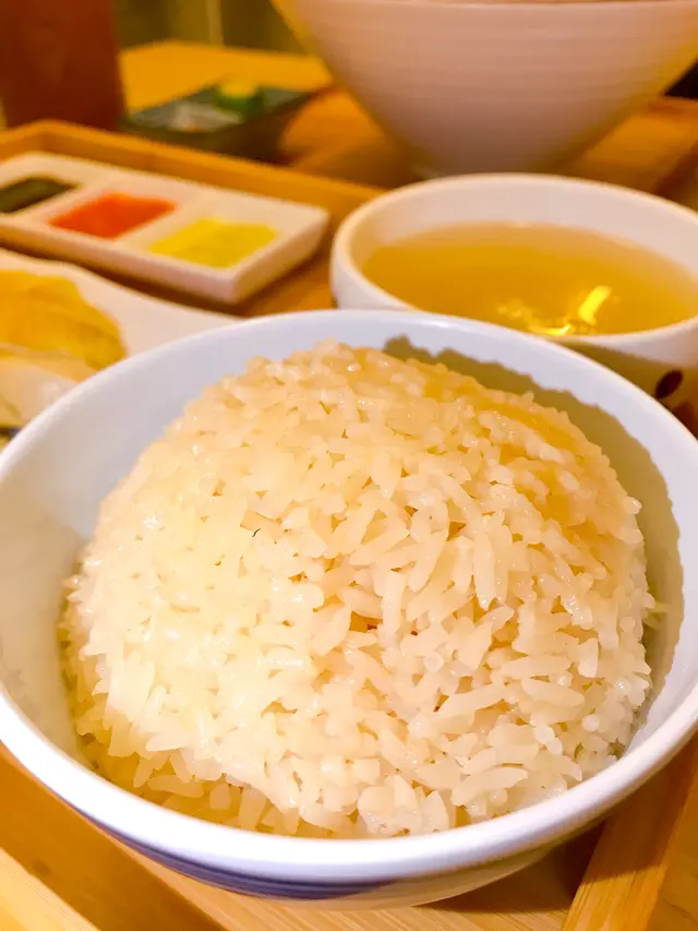海南雞飯用上了三黃雞,薄薄的一層雞皮油光透亮,裡面夾透明住啫喱狀的骨膠原,配上嫩滑高質的雞肉,一放進口中骨膠原在舌尖上慢慢化開,再喝一口清甜的冬瓜湯,滋味倍增!醬料有薑蓉、辣醬和甜豉油,我獨愛薑蓉,拌飯一流!