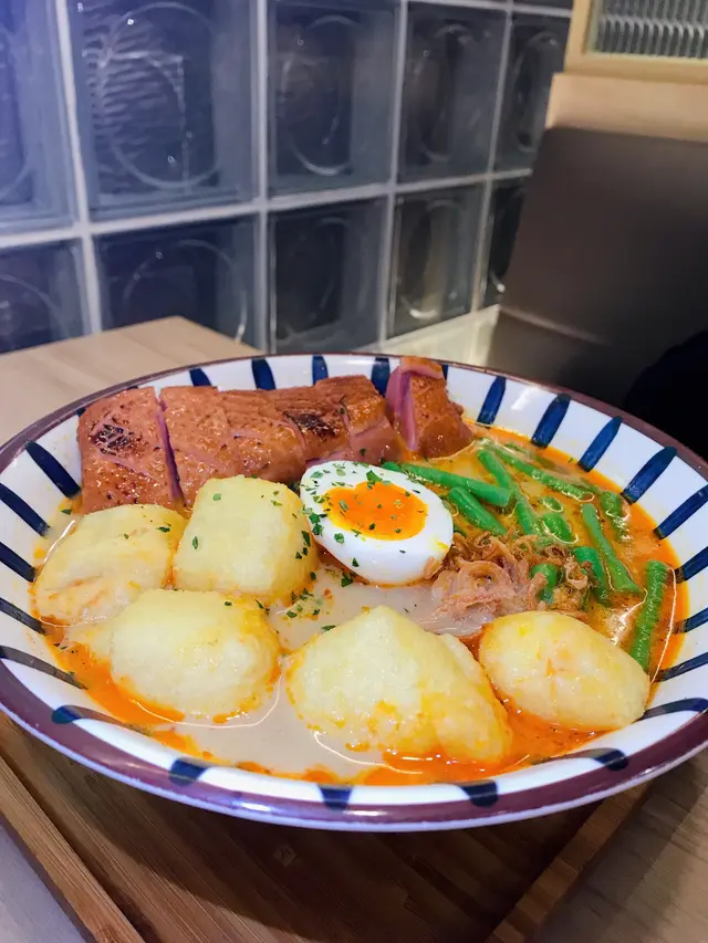 喇沙湯底椰香味濃,湯頭香辣惹味,用了很多香料去烹煮。湯碗份量非常大碗足料,裡面有茶燻鴨肉、溏心蛋、豆卜、通菜等,而且更有一些乾蒜粒和花生粒,口感多層次!米線也處理得okay,煮得煙韌。