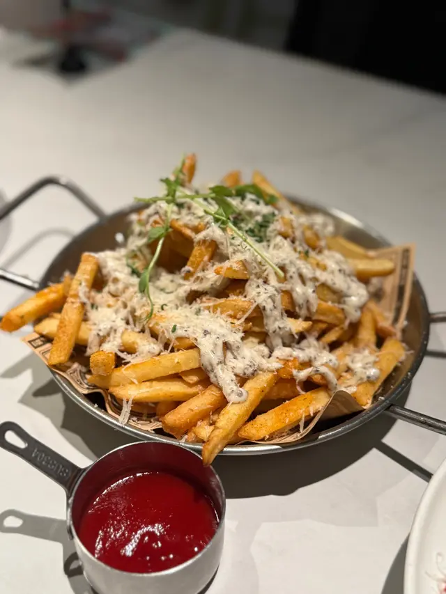 重點嚟啦!黑松露雪山芝士炸薯條 🍟絕對係必點!熱辣辣嘅粗薯條鋪滿芝士同黑松露醬,成座「雪山」咁,香氣撲鼻,食到舔舔脷😋。
