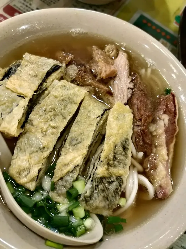 賣相整齊,五件牛腩五件紫菜腐皮卷切件排列,湯匙盛有翠綠蔥粒。先來一件牛腩,入味感覺軟熟,但少了以往邊位爽脆咬口。吃得有點不舒服,牛絲黏著牙齒,要不停用牙籤整理。再來將紫菜腐皮浸一下湯,以吸收湯水精華。腐竹加了紫菜混合湯水在口中磨嚼,味道具有層次,先有腐竹脆炸口感,再有紫菜獨有味道,美妙極了。紫菜腐皮卷只在上海珍珍獨有供應,不管在街市豆腐店,又或在其他上海麵店都未有此食品。制作方法雖然簡單,街市買生腐竹及紫菜紮成卷狀輕壓,放進滾油炸成金黃停油即可食用。但自己制作又只吃一兩件,難免會浪費大量食材,所以來上海珍珍品嚐是最佳方法。