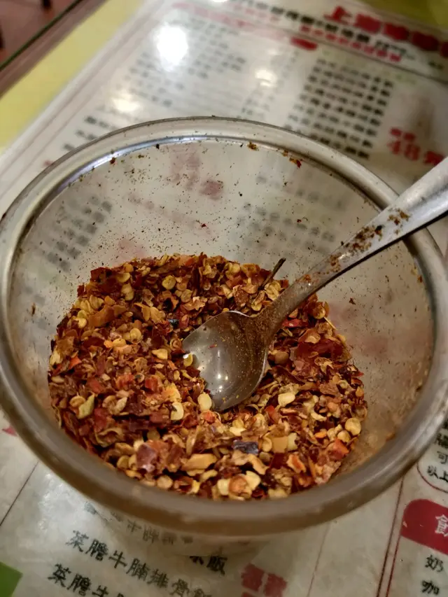 這樽又是上海珍珍獨有出品。外面吃上海麵多只提供豆瓣辣醬而已,但這兒卻加有打碎之乾辣椒。盛一匙灑在湯內,看著辣椒乾碎片遇水發漲,漸漸湯色變紅,辣味正宗,十分罕有特別。