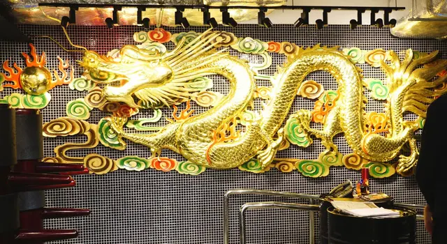 入口牆上的耀眼金龍, 是從舊式酒樓的婚宴龍鳳佈景中搬來, 給重新活化了, 代表著一代婚宴的龍與鳳現今真的賣少見少了。