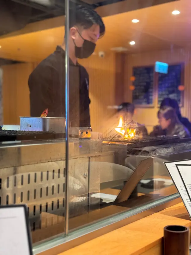 由6️⃣年前太子一條小巷至尖沙咀的中心,在graffiti的包圍下,水泥灰的門面還是讓餐廳帶點隱世小店的神秘感。門一打開卻是很明亮的木系吧枱,能夠全程欣賞師傅和徒弟不斷烤串燒,看他們又是灑鹽又是噴火槍🔥,可是享受表演的氛圍。難怪吧枱只有十多個位置,但平日晚上也有不少熟客。