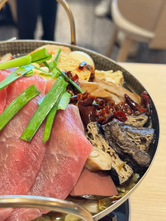 這鍋子,那股「臭」味立刻撲鼻而來,越聞越上頭。豆腐吸滿湯汁,咬下去瞬間爆發香濃,棒。鍋裡料非常多,鴨血嫩滑,肉片鮮美,微微的辣度,恰到好處地刺激著味蕾