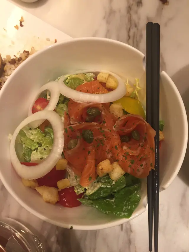 裡面有洋蔥, 沙律菜, 三文魚, 蕃茄仔, 面包脆脆, 黃椒, 少少沙律醬