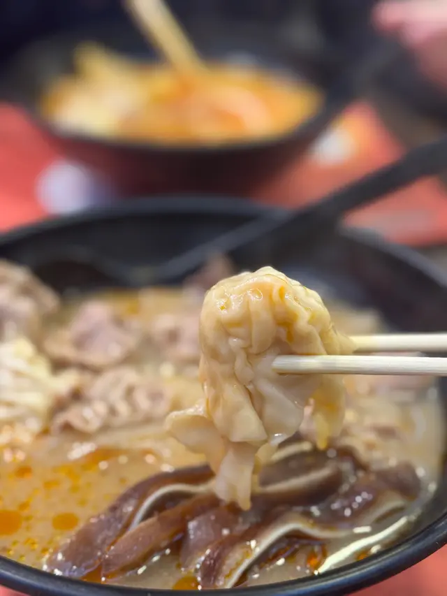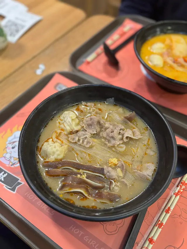 紅薯細粉+肥牛+豬耳+雲吞=細薯粉比較軟滑,薯粉容易消化,肥牛粉嫩粉嫩,麻辣湯底夠曬香同麻,又不會太嗆口,一啖湯一啖粉就最配合了,雲吞包裹已調味的大蝦,爽彈同時包持大地魚汁水,最喜歡豬耳的筋勁,有咬口。