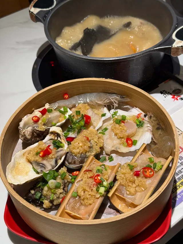 一坐低餐廳就準備和風雞煲!免費送架‼️食完雞煲再打邊爐,好爽!我地幫餐廳打卡後,仲送蒸海鮮添‼️送嘅海蝦一啲都唔馬虎!有鮑魚!元貝!生蠔!聖子!海蝦!真係有啲誇張!再食返兩盤和牛已經回本!牛肉都好高質,澳洲和牛牛脂比較重,肉質軟淋;牛肩胛少啲油脂,一樣咁軟淋,我比較鐘意呢款,冇咁heavy!