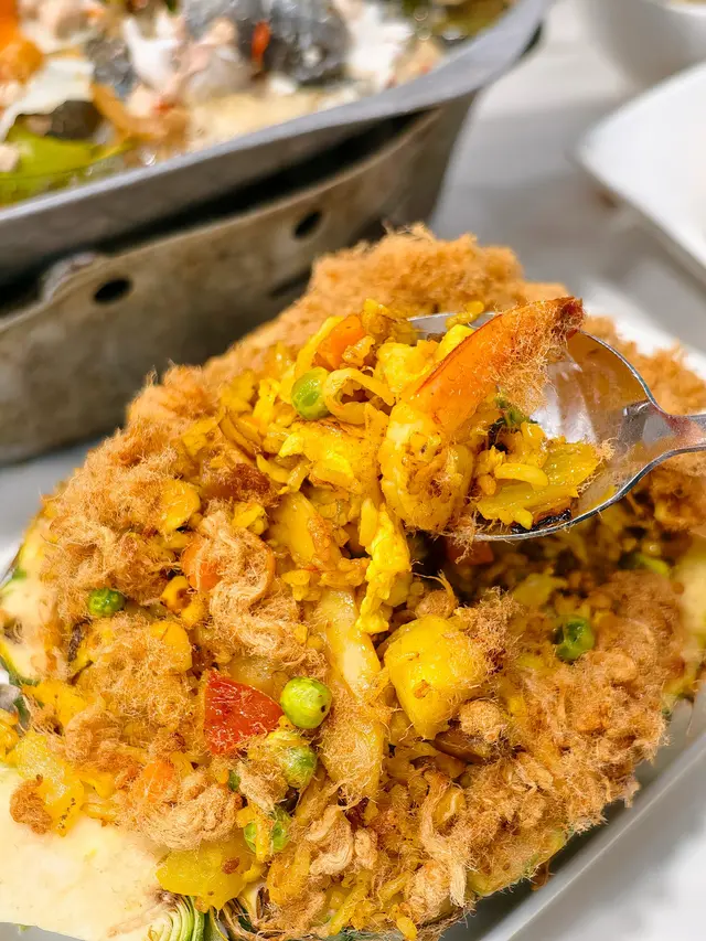 菠蘿海鮮炒飯料也很足,加了青口,蝦仁,魷魚,再配上大量的配料一起炒香,當然少不了香甜的菠蘿了,整體酸酸甜甜的,又有蛋香,海鮮味足。