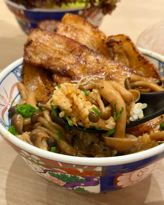 灸燒豚肉片🐷 • 蔥花菇菇🍄。豚肉片燒得夠焦香,夾出黎都幾大片嫁。飯有汁撈埋好容易清碗🥄