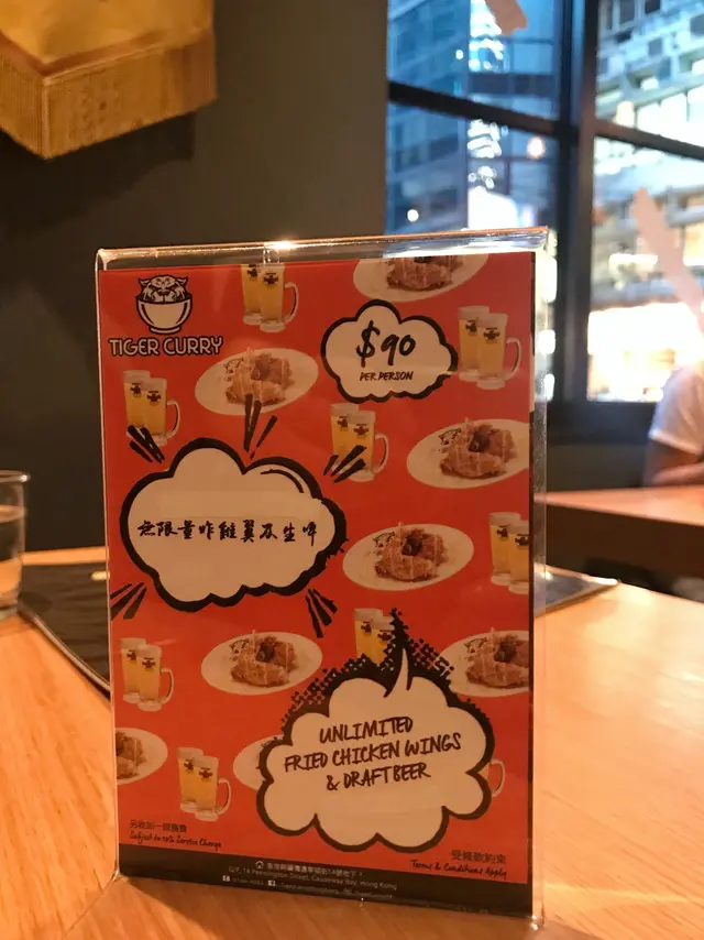Tiger Curry現正推出啤酒及炸雞翼歡樂時光優惠,只限銅鑼灣邊寧頓街分店。每日下午3:30至5:00或下午5:00至6:30的時段內,只需$90便可無限暢飲Suntory生啤及任吃炸雞翼,作為happy hour,也不錯呢。