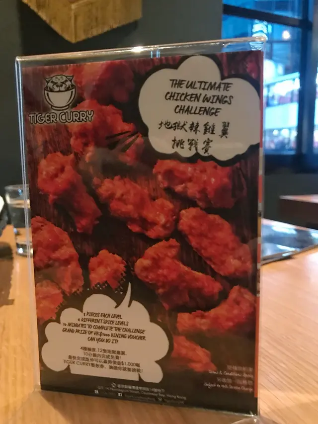 原來Tiger Curry正推出辛辣雞翼挑戰賽。四個辣度的雞翼,每級各3隻,辣度由微辣到最終極的勁辣,10分鐘時限內吃完,便可獲免雞翼收費,兼登上龍虎榜再參加Tiger Curry終極比試,勝出者可獲限期三個月價值HK$1,000的餐廳消費額。