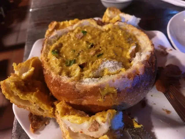 衝住佢哋個「咖喱蟹肉焗麵包」嚟!上枱熱辣辣,成個麵包挖空裝滿濃郁黃咖喱,蟹肉多到瀉出嚟,仲有啖啖彈牙魷魚同蝦仁!重點係個麵包蓋焗到超脆,撕落嚟點咖喱汁,甜辣惹味仲帶椰香,掛汁力100分~食到底連麵包碗都吸晒精華,軟綿綿索盡咖喱,邪惡到停唔到口!