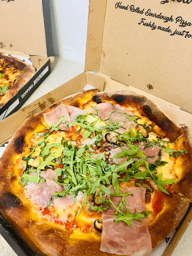配料有番茄、水牛芝士、烤蘑菇、蒜蓉、火箭菜、巴馬臣芝士同埋主角帕瑪火腿 😍 呢個 d 料好多,尤其帕瑪火腿,真係啖啖肉 🤤 因為有帕瑪火腿同埋巴馬臣芝士,所以口味屬於鹹香,配合煙靭嘅餅底真係幾唔錯 🙆🏻♀️