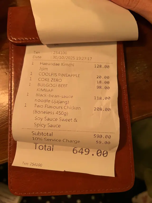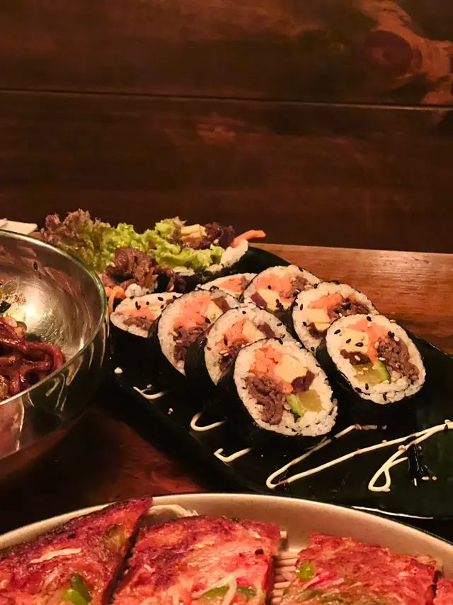 煎餅份量很大,材料十分豐富:有泡菜、紅綠椒及洋蔥,味帶微酸及少辣,煎餅邊微焦香之餘還很脆口