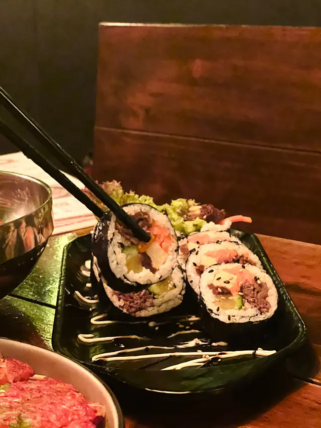 飯卷選用了牛肉、爽脆黃瓜、香甜蛋皮、紅蘿蔔絲和生菜等材料,再用紫菜包裹著,牛肉意想不到很香,牛味頗濃,每啖都有多重口感🈵