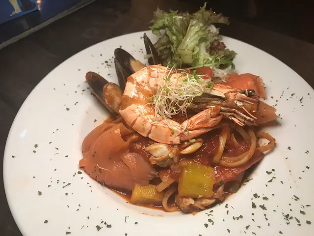 意粉等左一陣就已經上左檯,見到好多海鮮,超開心。蝦經過調味先再拎去炸,隻蝦連殼咁食,非常有風味;而三文魚、青口都非常肥美,食得左係新鮮野。意粉落左青、紅椒同蕃茄去煮,都幾開胃。