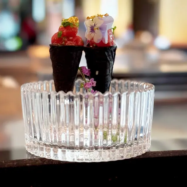 二人餐的吞拿魚金箔脆筒賣相迷你可愛!鮮香的吞拿魚配上竹炭脆筒口感好豐富,作為前菜清新美味好不錯啊。