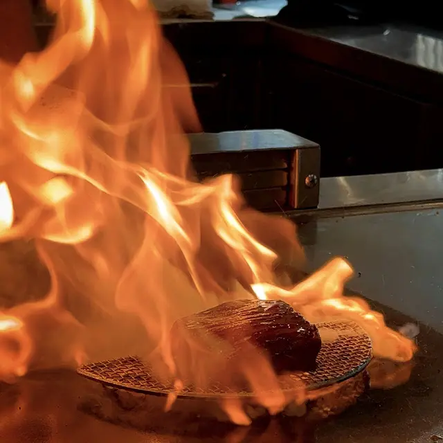選大分A5和牛厚燒更可欣賞充滿煙火氣的環節,火光四射的時候大家也興奮地絕對是拍照打卡之最。